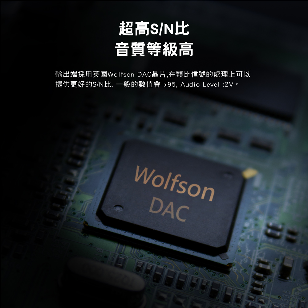 內建英國Wolfson DAC晶片提供專業級的聲音輸出,提供S/N信噪比>95聲音參數