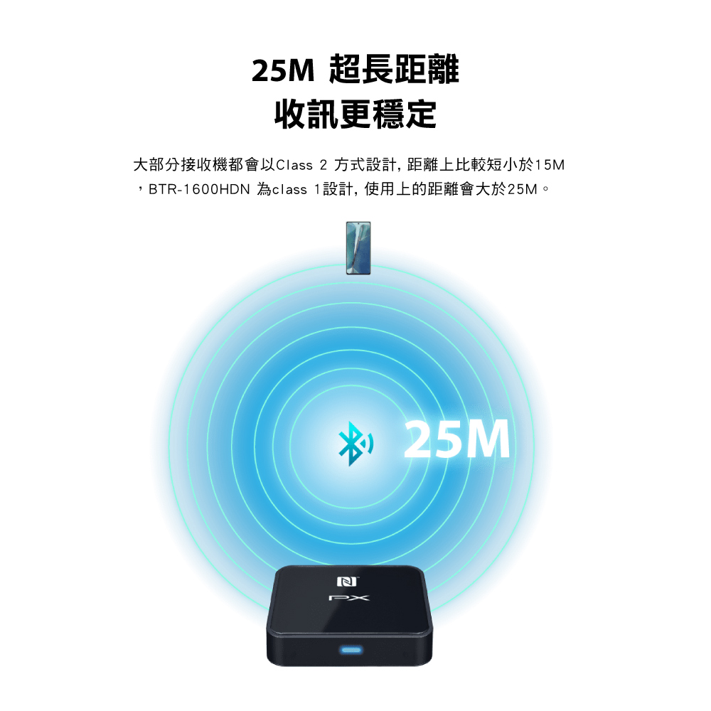 . 25M超長距離:Class 1設計,傳輸距離更長,收訊更穩定