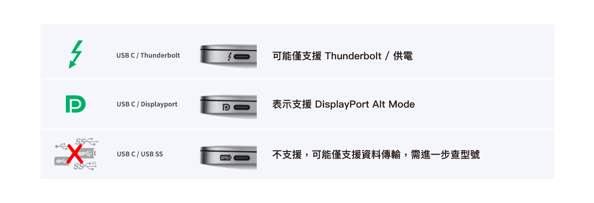 | 只有閃電符號 | 可能僅支援 Thunderbolt / 供電 |