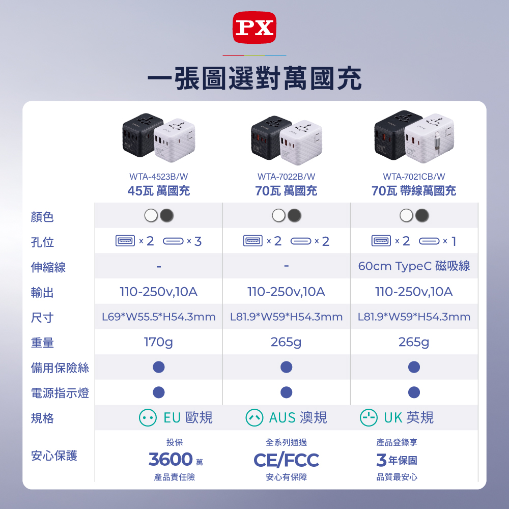 PX大通 45W瓦萬國轉接頭2A3C 氮化鎵萬國插頭 Type C+USB A 旅行轉接插座 旅遊充電必備(WTA-4523W/B)