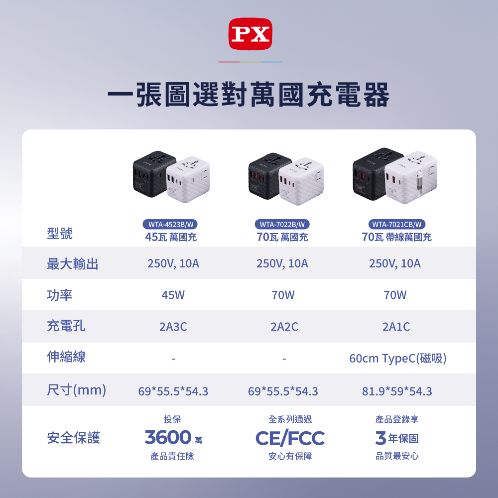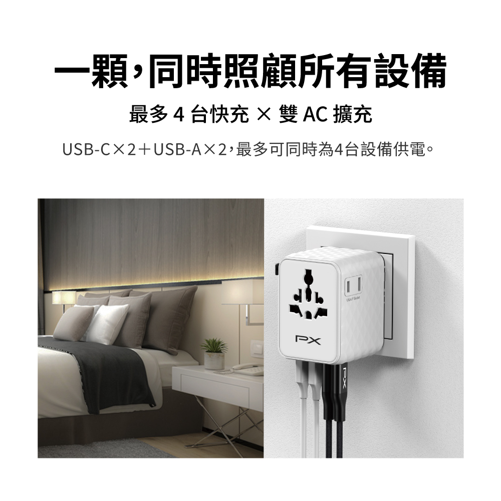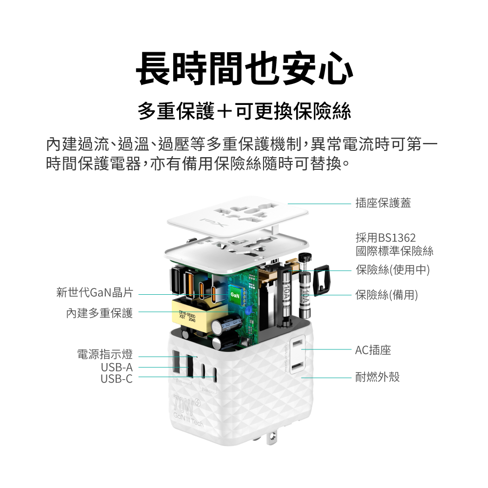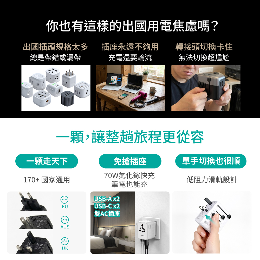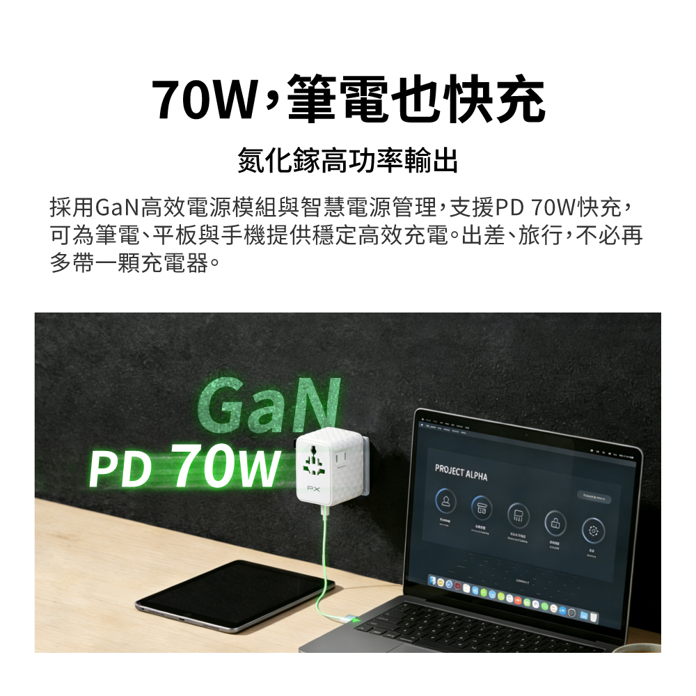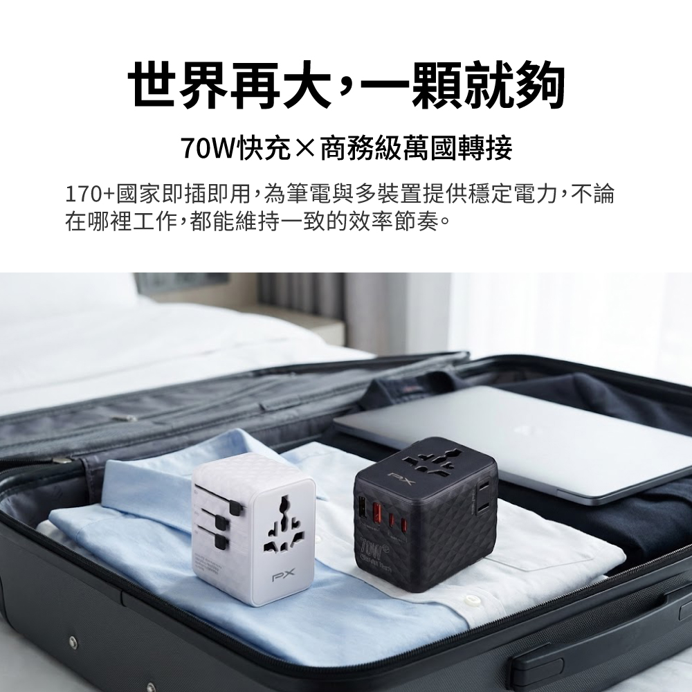 PX大通 70W瓦萬國轉接頭2C2A 氮化鎵萬國插頭 Type C+USB A 旅行轉接插座 旅遊充電必備(WTA-7022W/B)