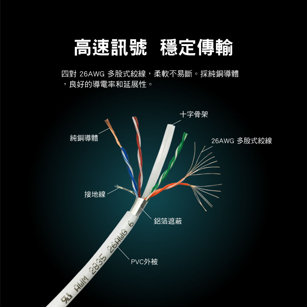-四對 26AWG 多股式絞線,柔軟不易斷。採純銅導體,良好的導電率和延展性。