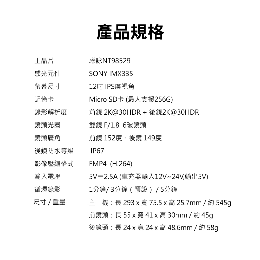 鏡頭FOV(D):前鏡152度 / 後鏡149度
