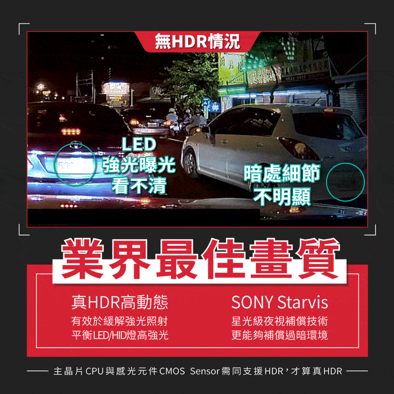 1.HDR高動態錄影+SONY STARVIS星光夜視技術>>抗LED強光、夜間車牌清晰