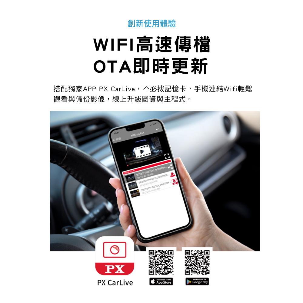 獨家PX CarLive APP,手機輕鬆觀看與備份影像、圖資與程式升級。
