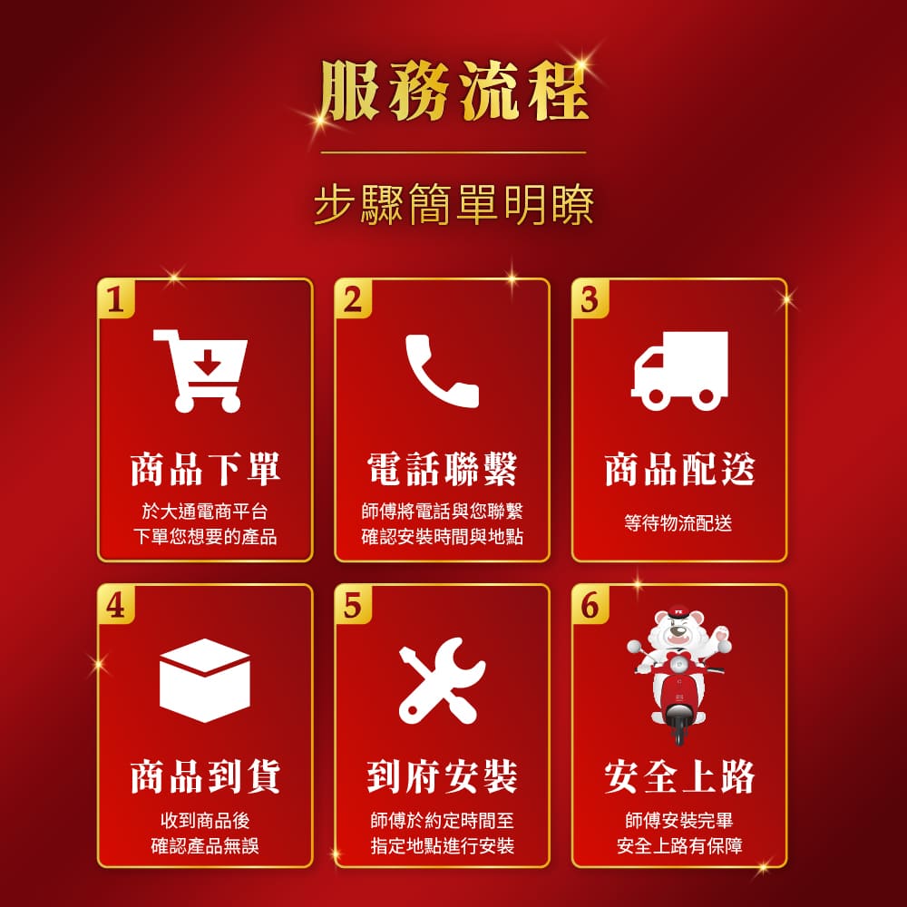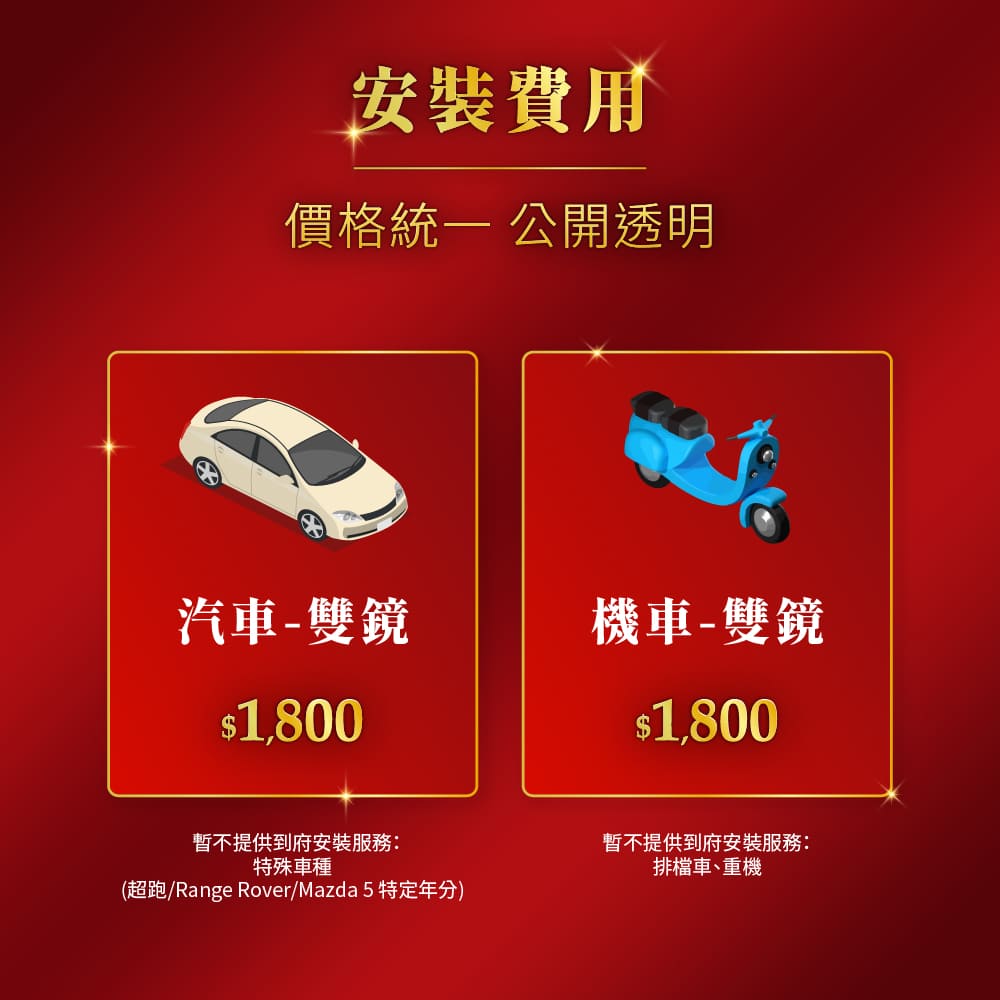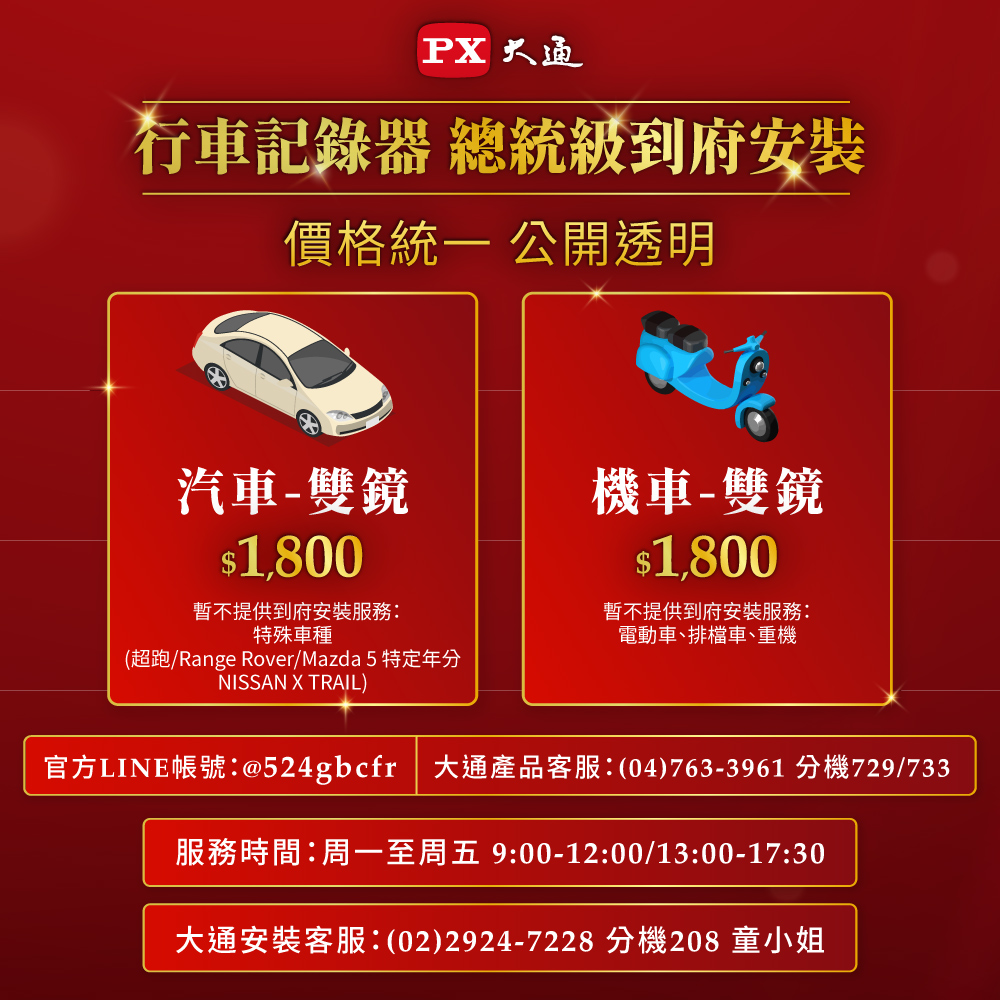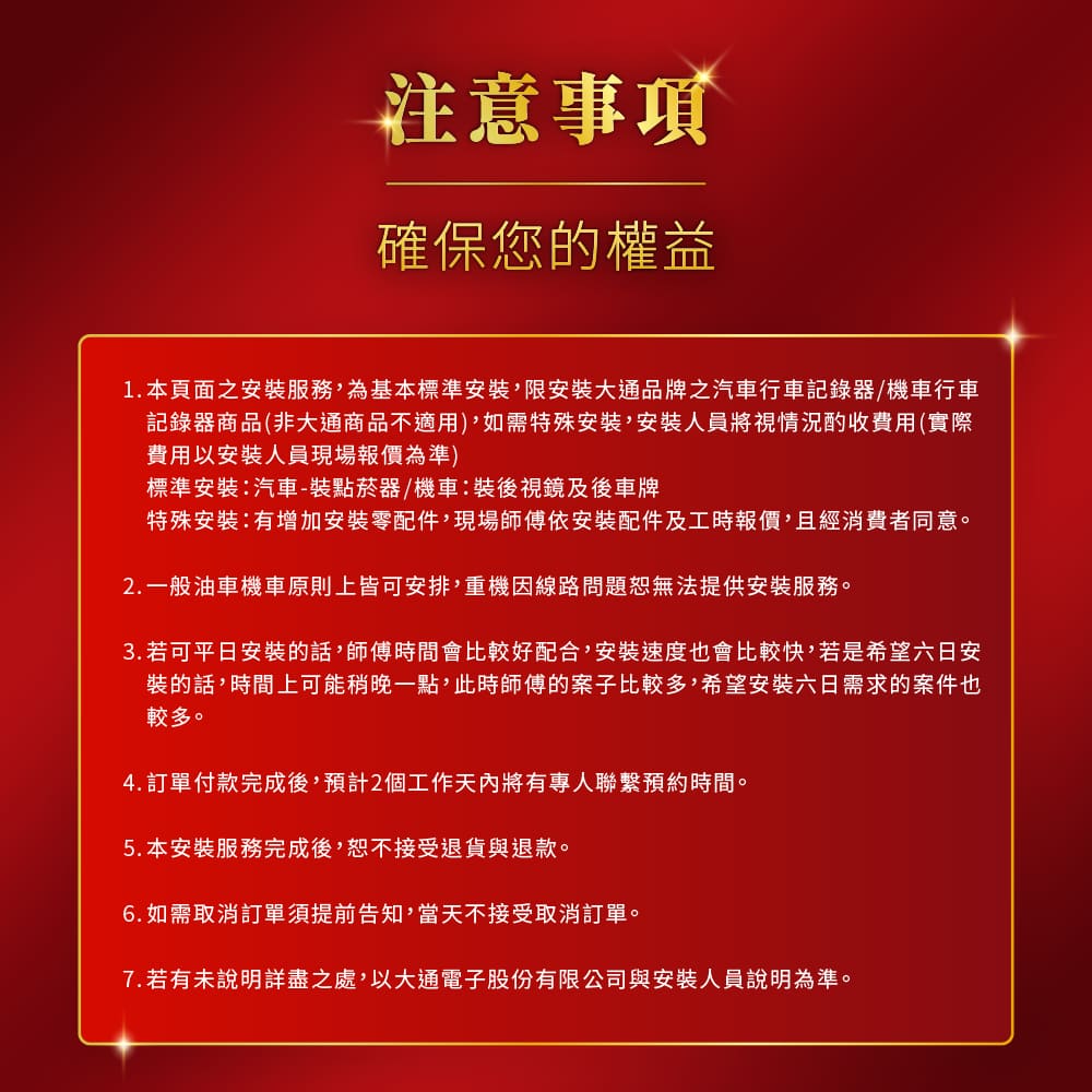 - 2. 本頁面之安裝服務,為標準安裝,限安裝大通品牌之汽車行車記錄器/機車行車記錄器商品(非大通商品不適用)