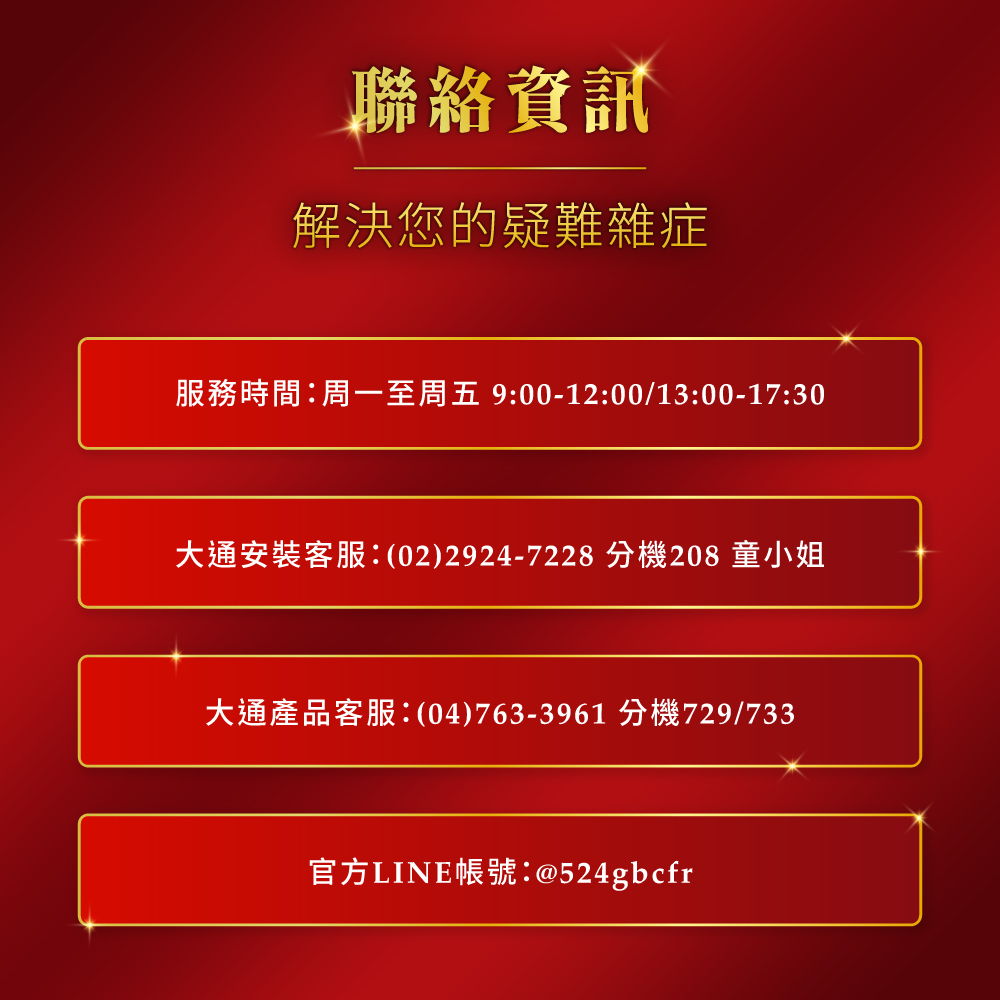 - 本頁面之安裝服務,若有未說明詳盡之處,以大通股份有限公司與安裝人員說明為準