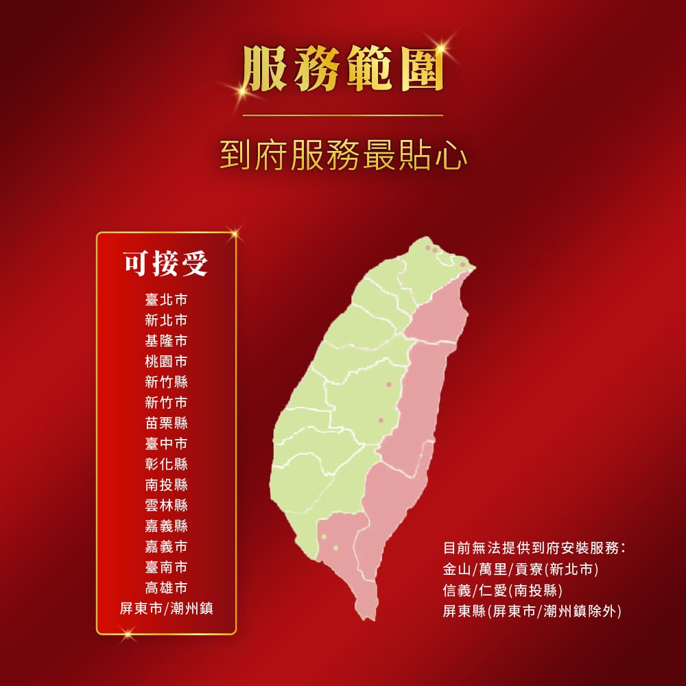 - 服務範圍限台灣西邊本島各縣市,不含宜蘭/花蓮/台東以及特殊偏遠區域。