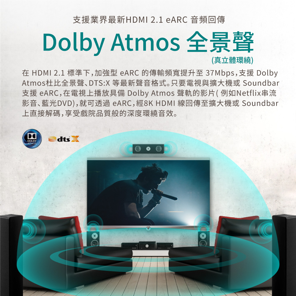 *完美環繞音效eARC,支援Dolby Atmos, DTS x環繞聲訊號