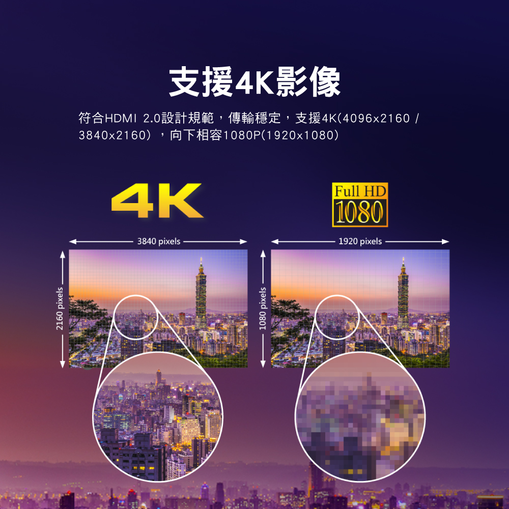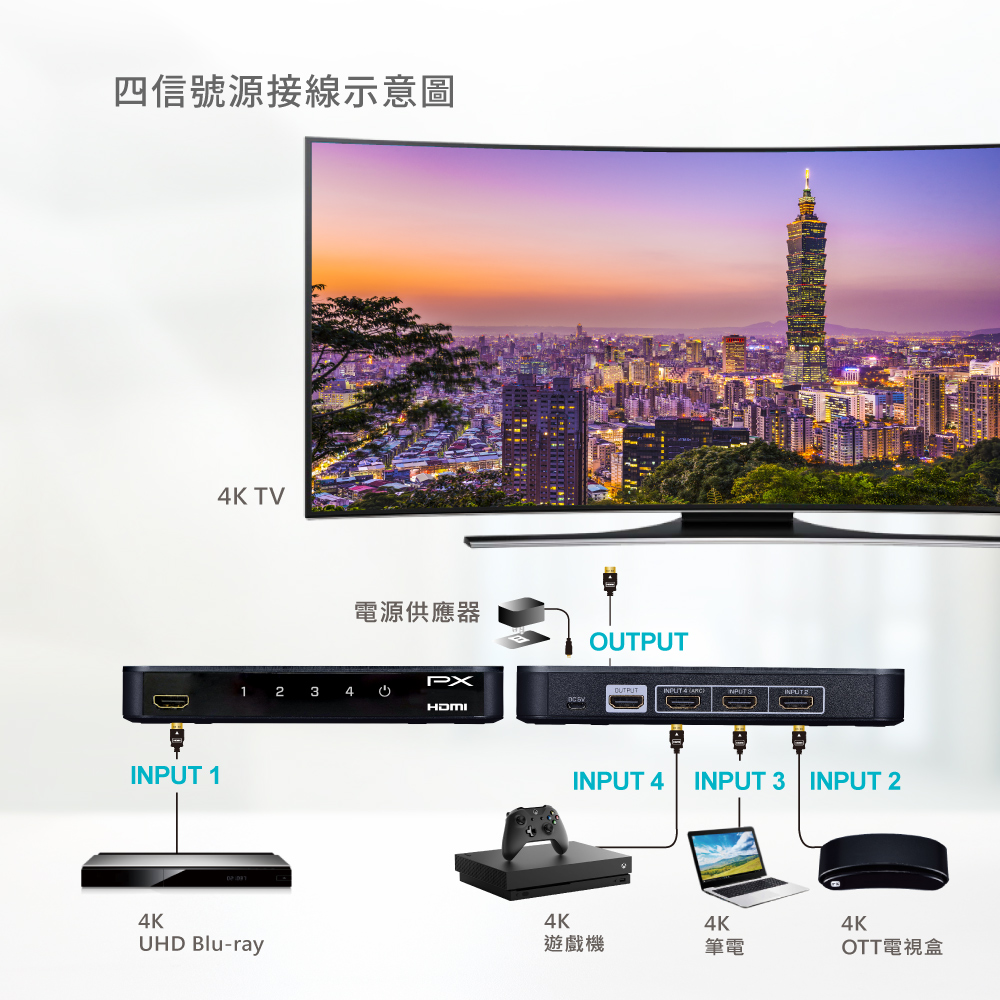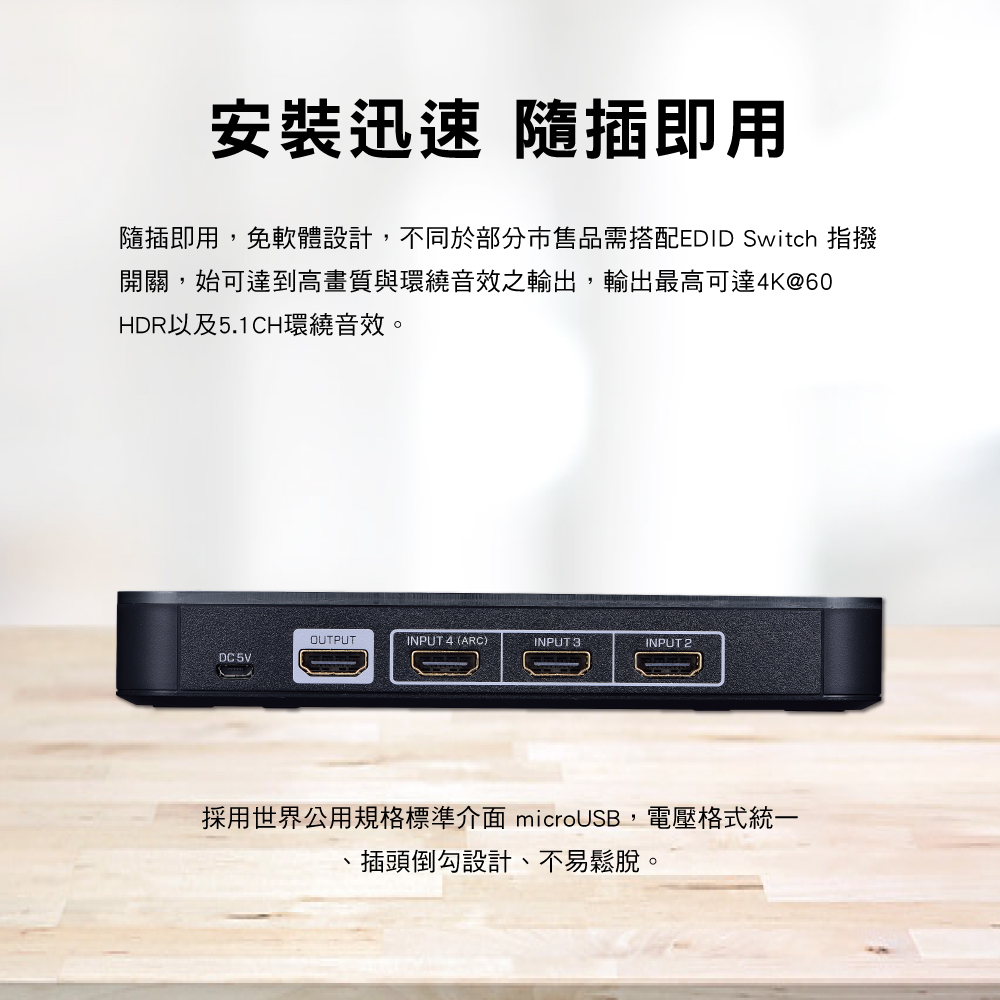 *4組4K信號源輸入,1組4K信號源輸出,擴充電視HDMI介面
