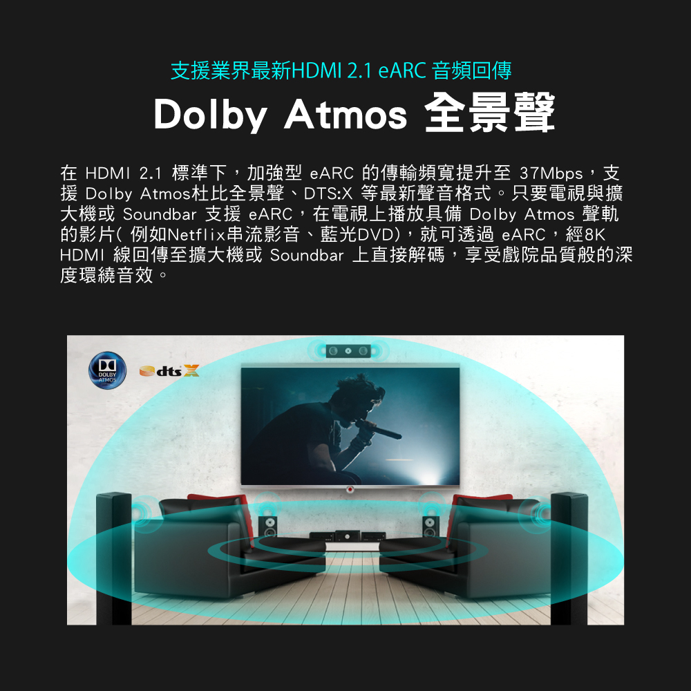 *完美環繞音效eARC,支援Dolby Atmos, DTS x環繞聲訊號