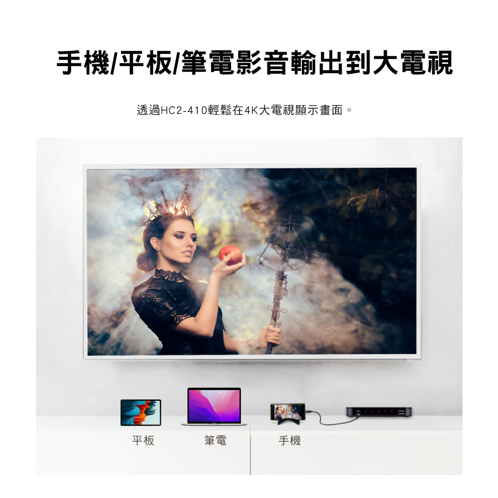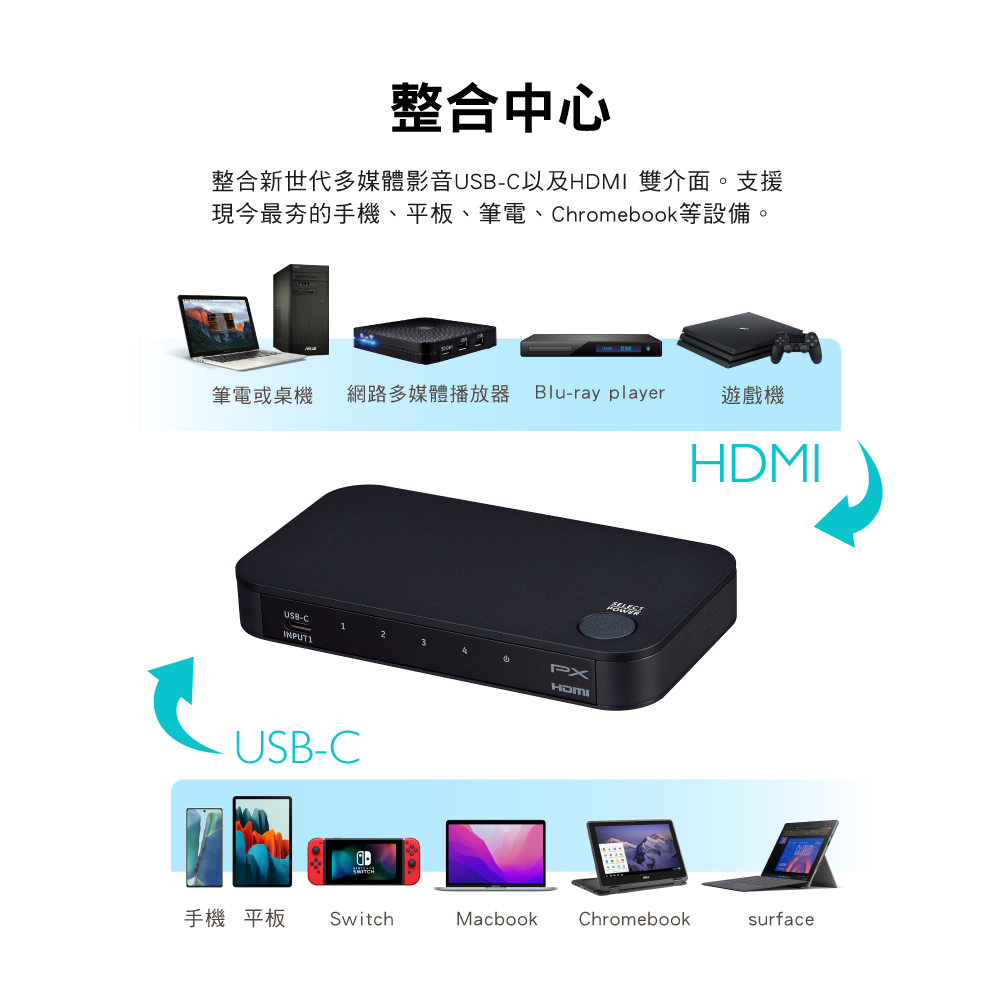 。整合中心:整合新世代手機、平板USB TYPE C以及傳統HDMI影音設備