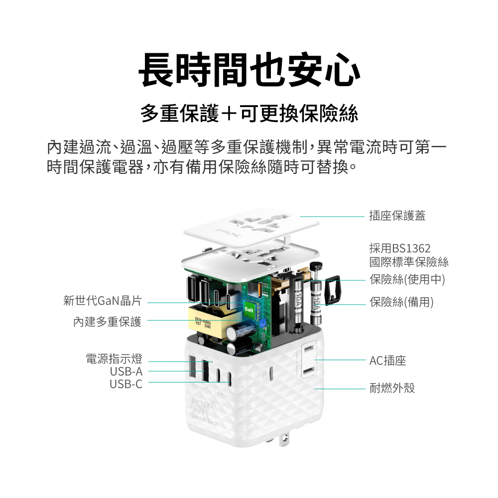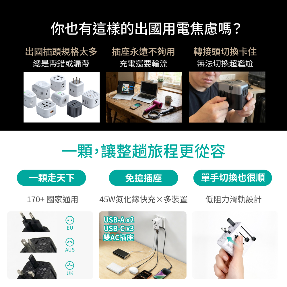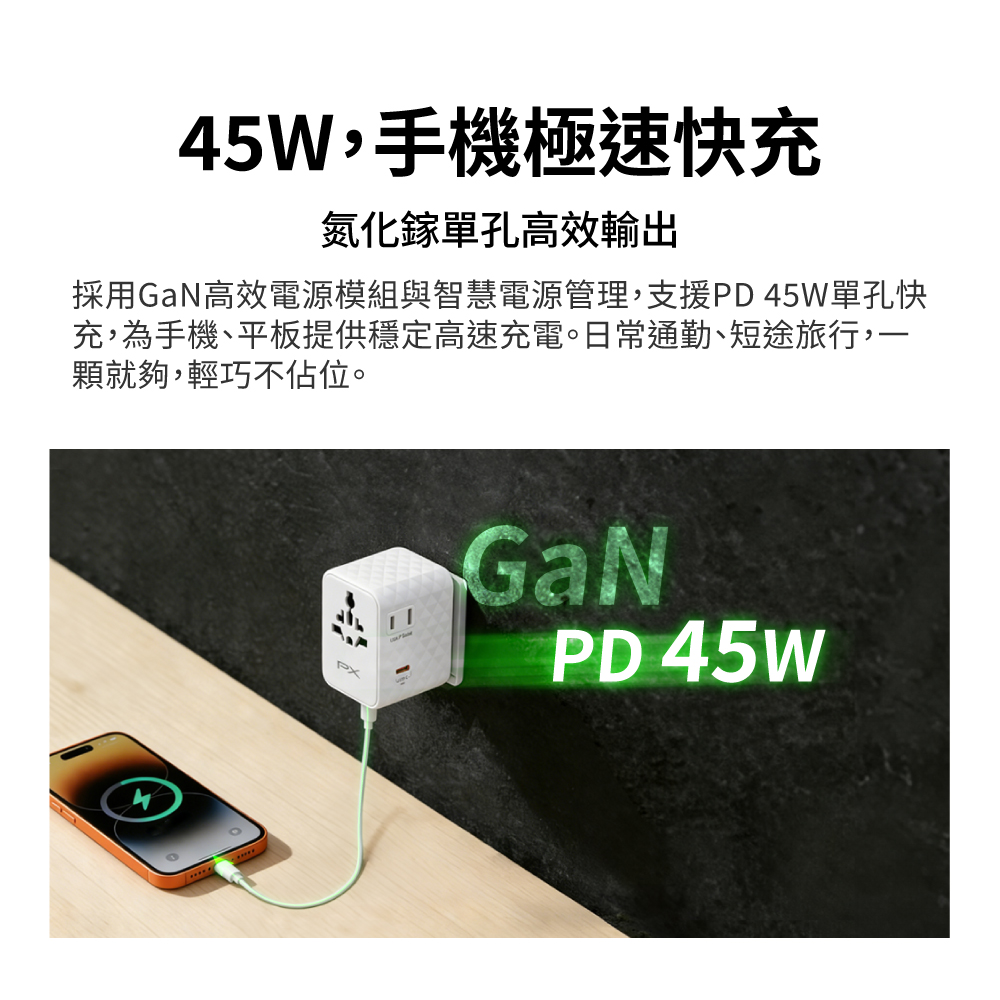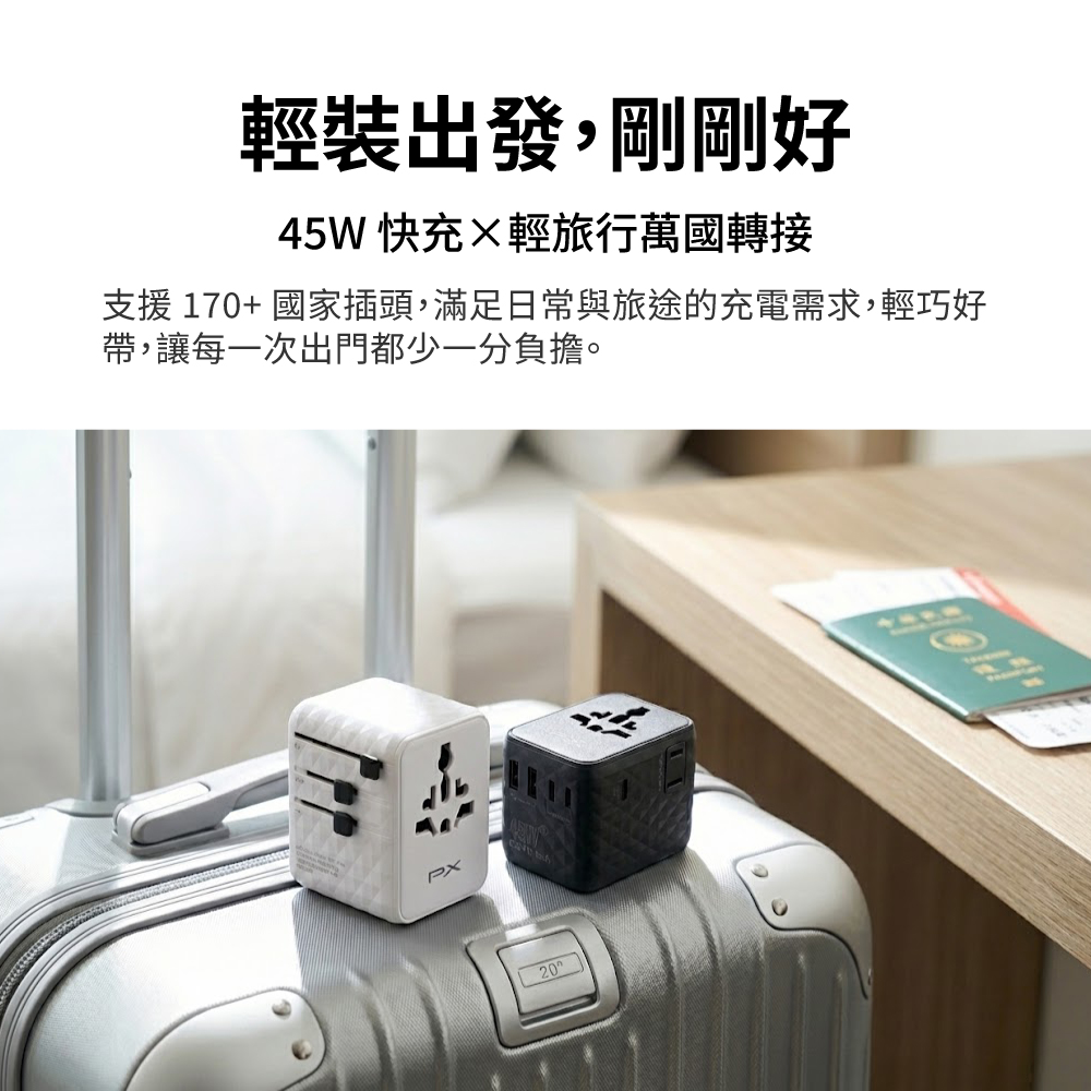PX大通 45W瓦萬國轉接頭2A3C 氮化鎵萬國插頭 Type C+USB A 旅行轉接插座 旅遊充電必備(WTA-4523W/B)