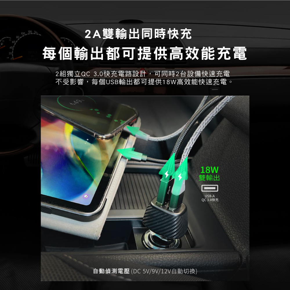 獨立USB電路設計,2組USB-A (QC) 快速充電埠,滿足2台設備同時充電不影響