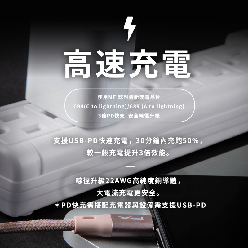 •22AWG線徑升級,高純度銅導體,大電流充電更高效率