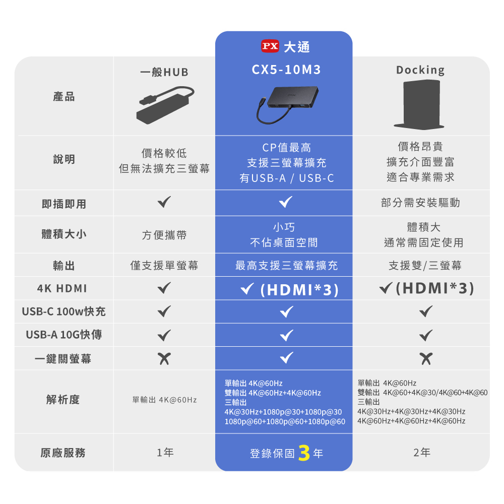 4K MST HUB 高效三螢擴充器 一鍵開關 100W快充 10Gbps傳輸 (CX5-10M3)