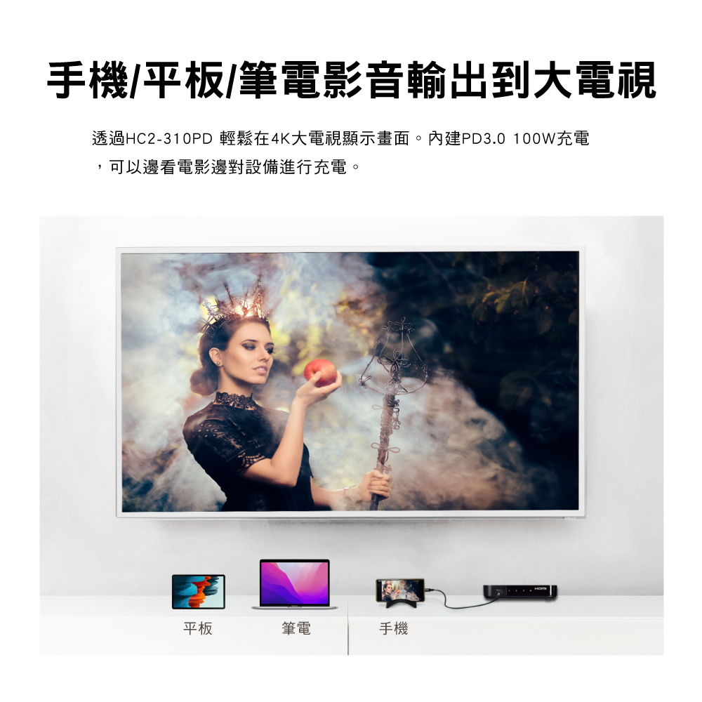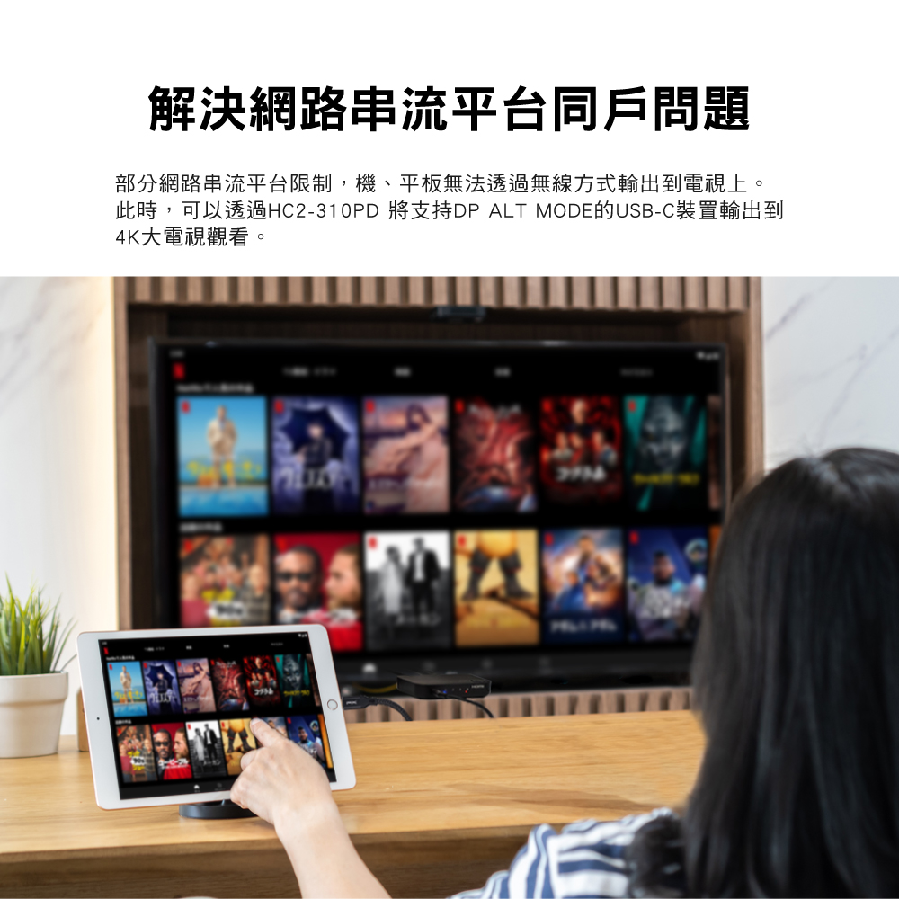 。整合中心:整合新世代手機、平板USB TYPE C以及傳統HDMI影音設備
